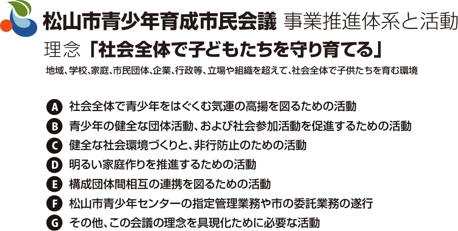 松山市青少年育成市民大会やソフト事業の企画・運営を継続し、青少年と地域、各構成団体との連携強化や青少年の育成活動の活性化に努める。