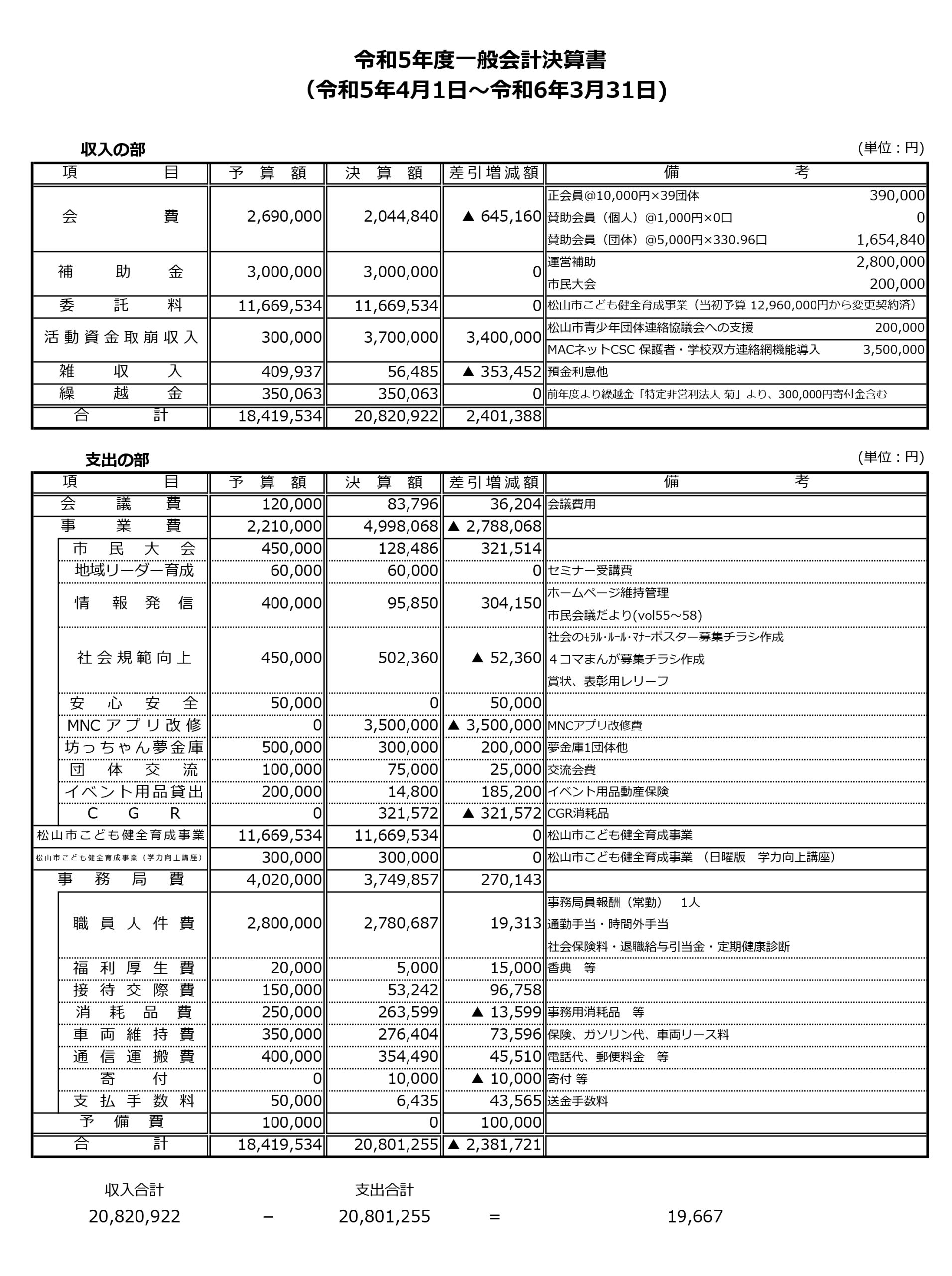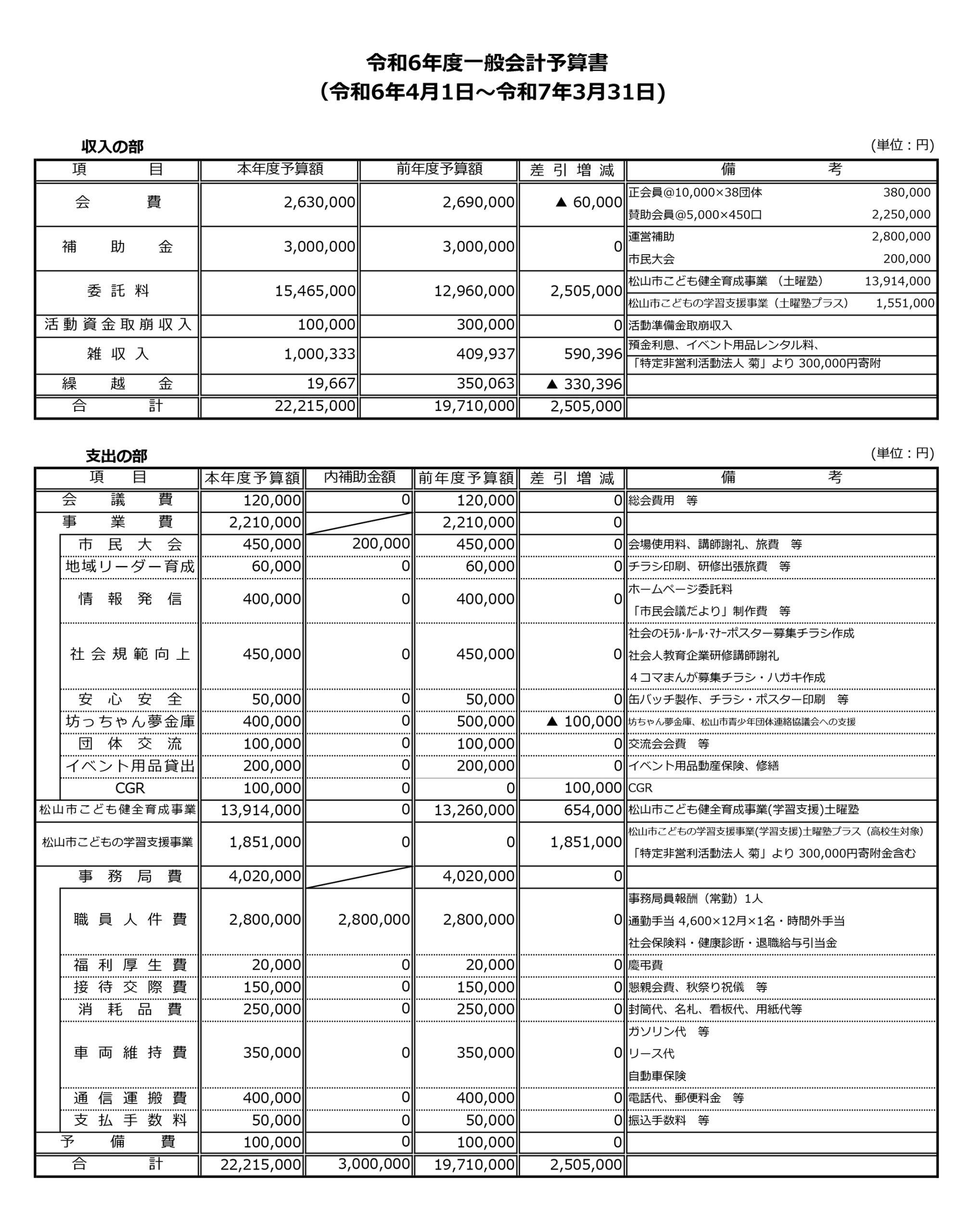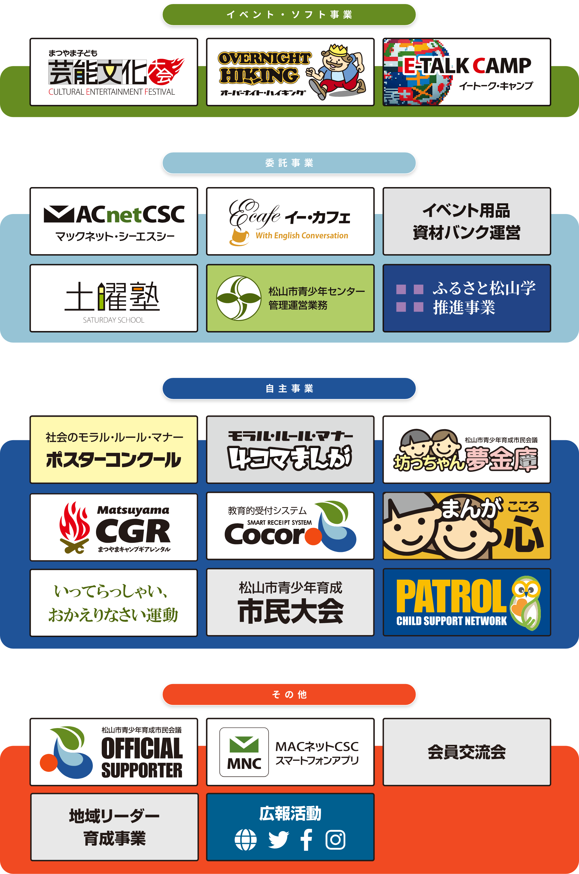 | 5月17日 | 第19回 定期総会 ANAクラウンプラザホテル松山 ダイヤモンドボールルーム 代議員数126名 委任状を含む101名回答 ★会長:久保継二(再任) ★副会長 :西村直樹/米田順哉/二宮秀秋/清水怜(新任) ★監事 :梅林哲次(再任)/藤岡盛明(新任) ★顧問 :宮内正民/山本素直 ★55構成団体 ★OS36社 地域リーダー育成事業/坊っちゃん夢金庫/イベント用品 資材バンク用具貸出 長尺印刷・軽トラック貸出等/安心安全情報(不審者情報)の共有化 社会規範向上(ポスターコンクール・4コマまんが・まんが心の活用) MACネットCSC/ソフト事業推進(オーバーナイトハイキング・松山子ども芸能文化大会) 市民大会企画運営/賛助会員・オフィシャルサポーター募集/会報の発行 松山市子ども健全育成事業 『土曜塾・土曜塾プラス』 青少年センターコミュニティ創出事業 『Eカフェ・ヴァーチャルカンバセーション』 個人向けキャンプ用品無料レンタル事業『CGR』 |