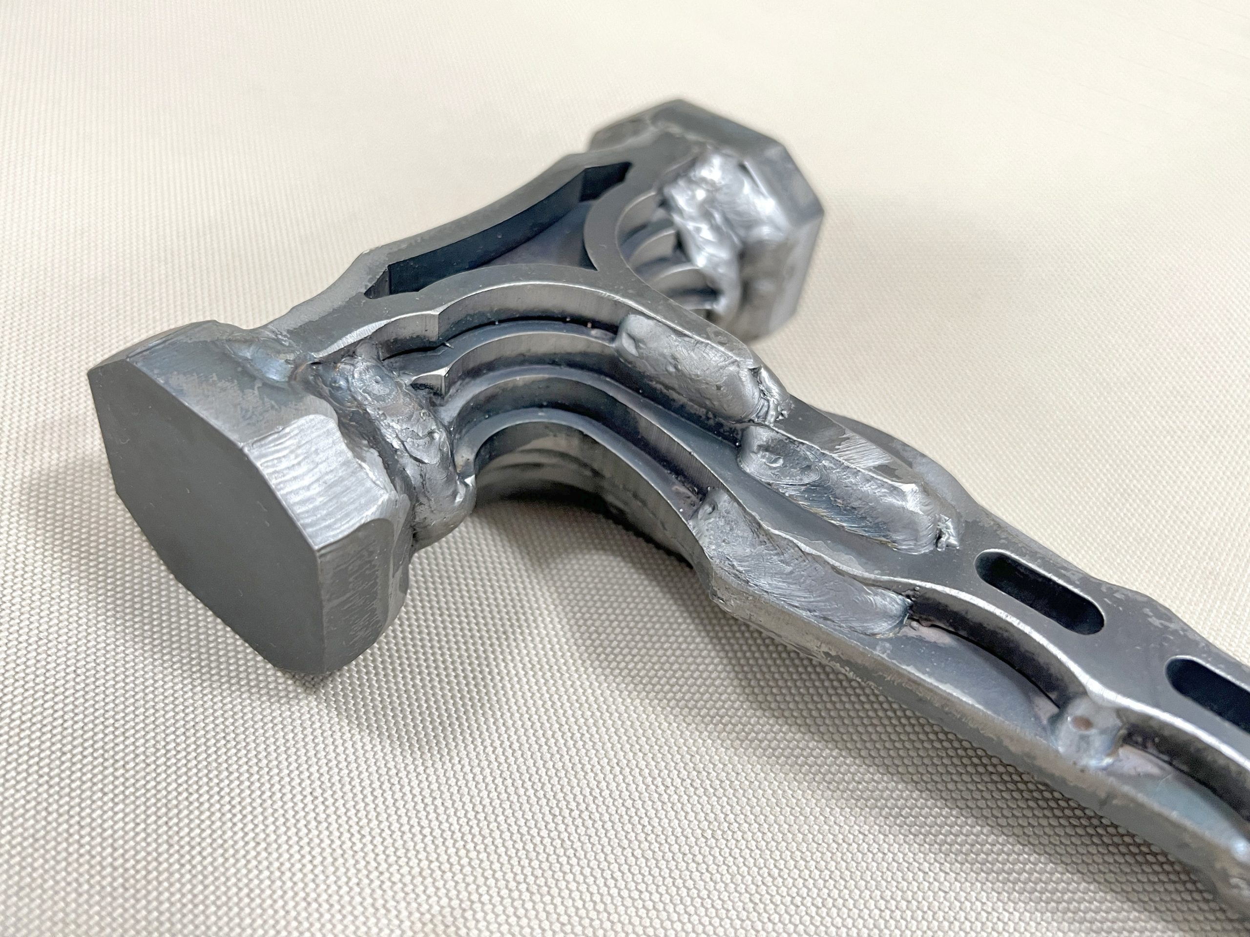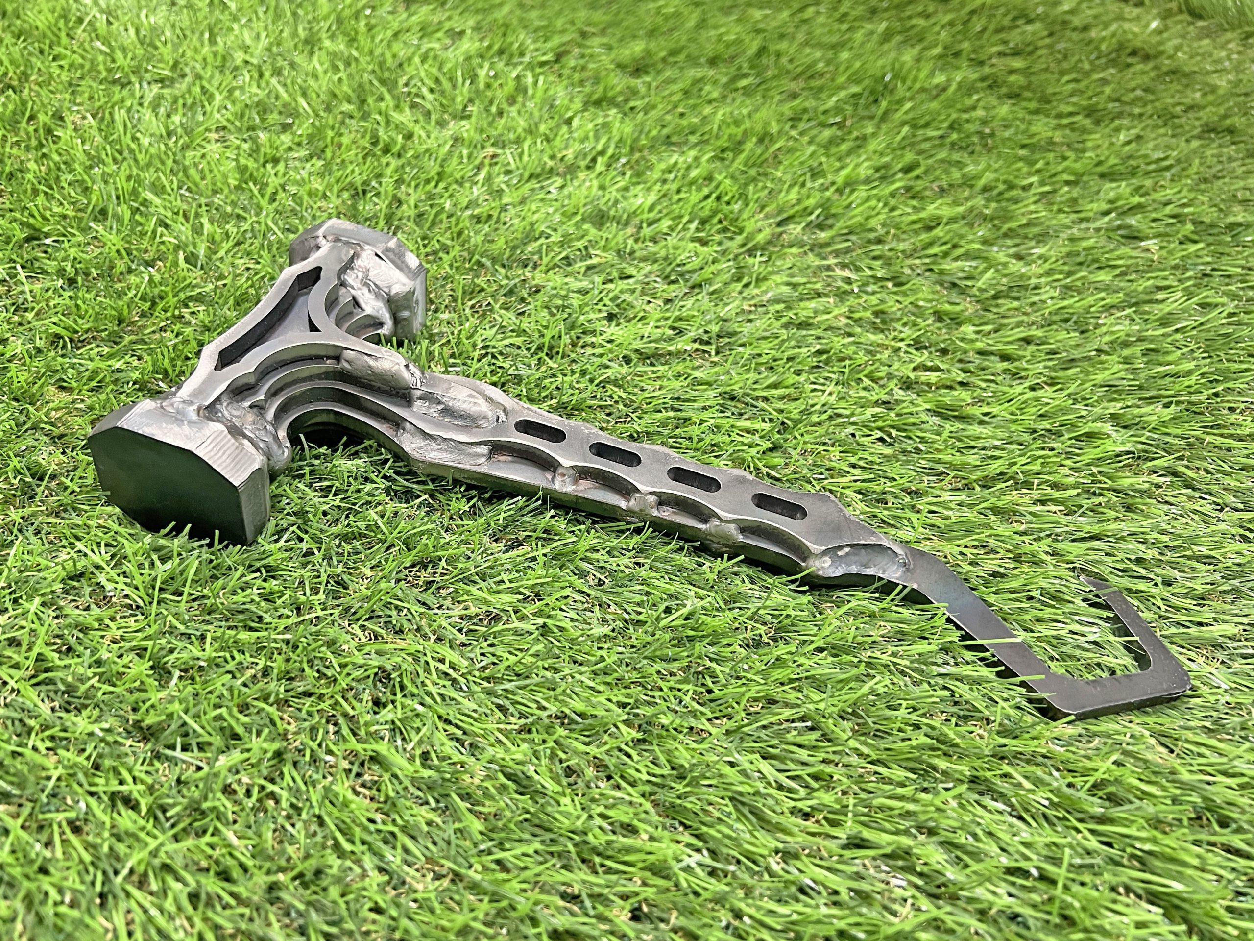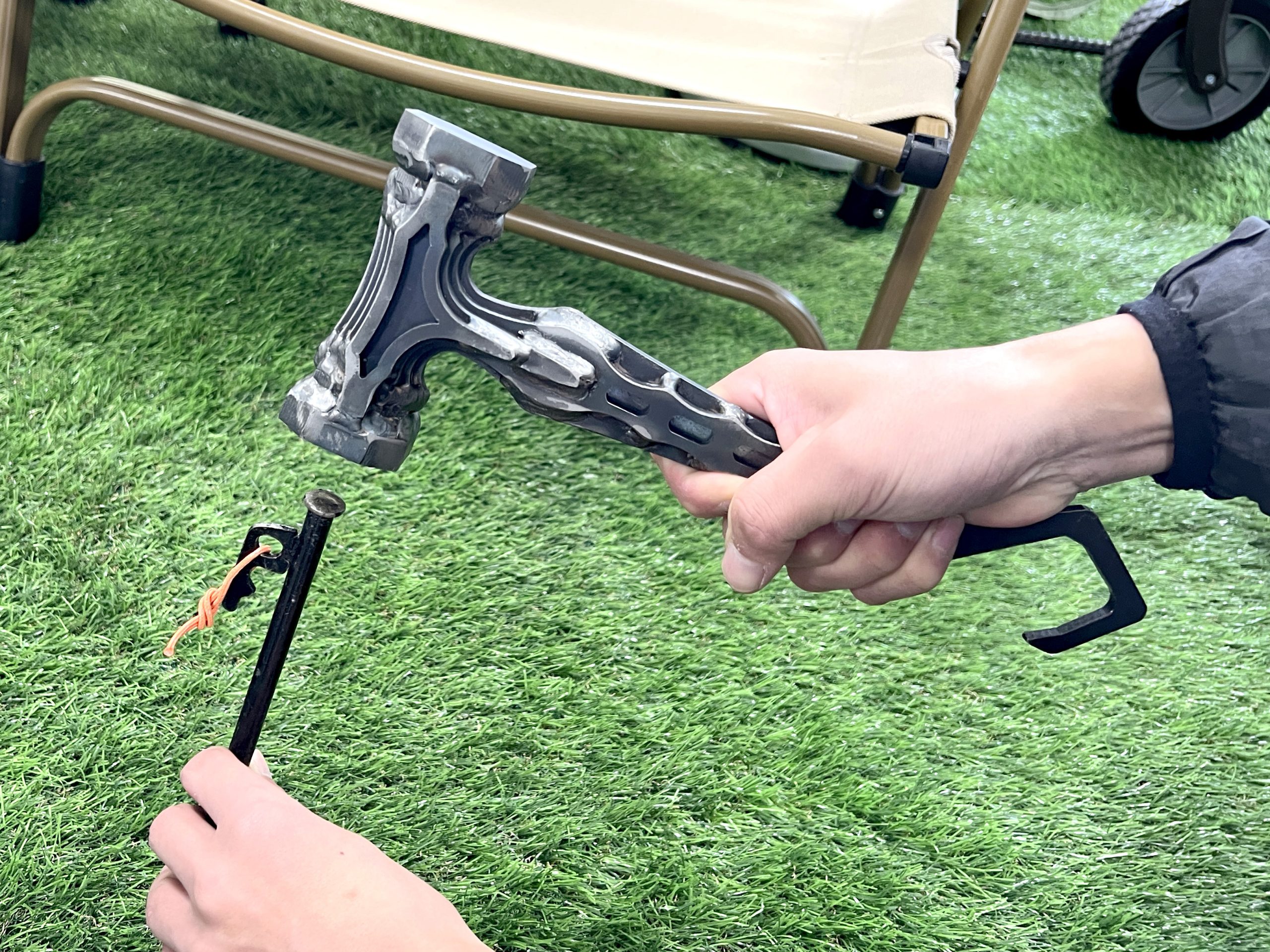 無骨なデザインのペグハンマー 鉄製ハンマーは最も打撃力が高く、地面が硬い場所でも少ない力でペグを打ち込めます。 機能性というよりもキャンプを楽しませてくれるアイテムです。