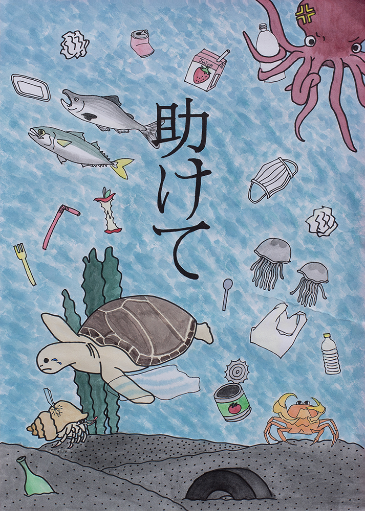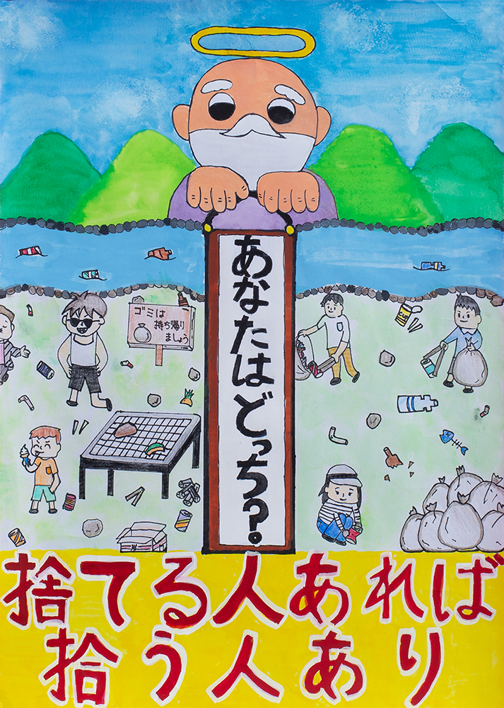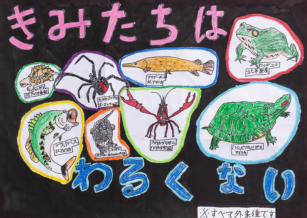 小学生の部の最優秀作品は「捨てる人あれば、拾う人あり」というキャッチコピーが人と神にかけてあり、イラストにも神様がいるという、アイデアがよく練られている上にイラストもしっかり描けています。優秀作品は外来生物に着目して、飼い主のモラルに訴えています。鋭い着眼点といえます。「きみたちは、わるくない」というキャッチコピーもよく考えられています。