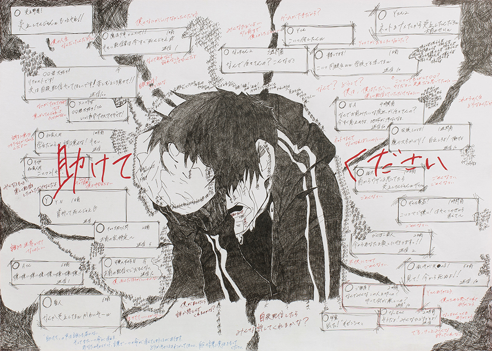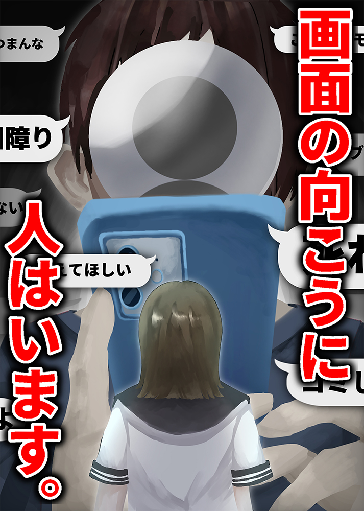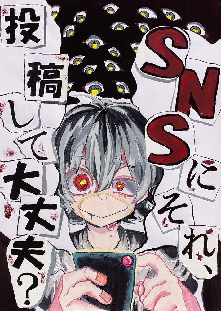 今回は中学生の部に審査員特別賞を設けました。ネットでのいじめや犯罪が社会問題になっていますが、それに着目してボールペンを使って熱意をもって細かく仕上げています。ポスターとして、パッと見て何を訴えているかわかりにくいですが、見れば見るほどひきつけられて考えさせられる表現はよく考えられ優れていたので特別賞としました。