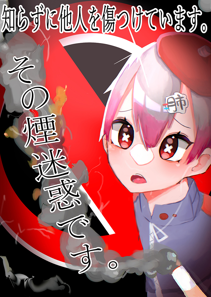 中学生の部の最優秀作品はPCを使ってクォリティーの高いイラストを描き、「その煙迷惑です」というキャッチコピーのレイアウトは煙のように文字を配置してよく工夫されています。優秀作品は抜群の描写力と構成力で表現されています。人物の表現やレタリングがとてもよく描けています。これが、1年生の作品ですから驚きです。