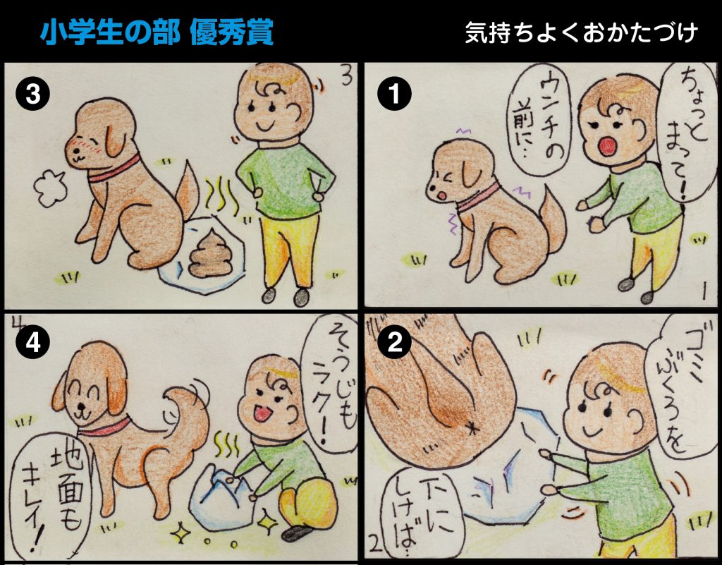 小学生の部について。どちらの入賞作品もイラストがうまいです。小学校5年生とは思えないレベルの描画力です。最優秀作品は犬が浮くという展開がよく考えられています。優秀作品は犬のウンチという表現しにくい内容をうまくまとめています。