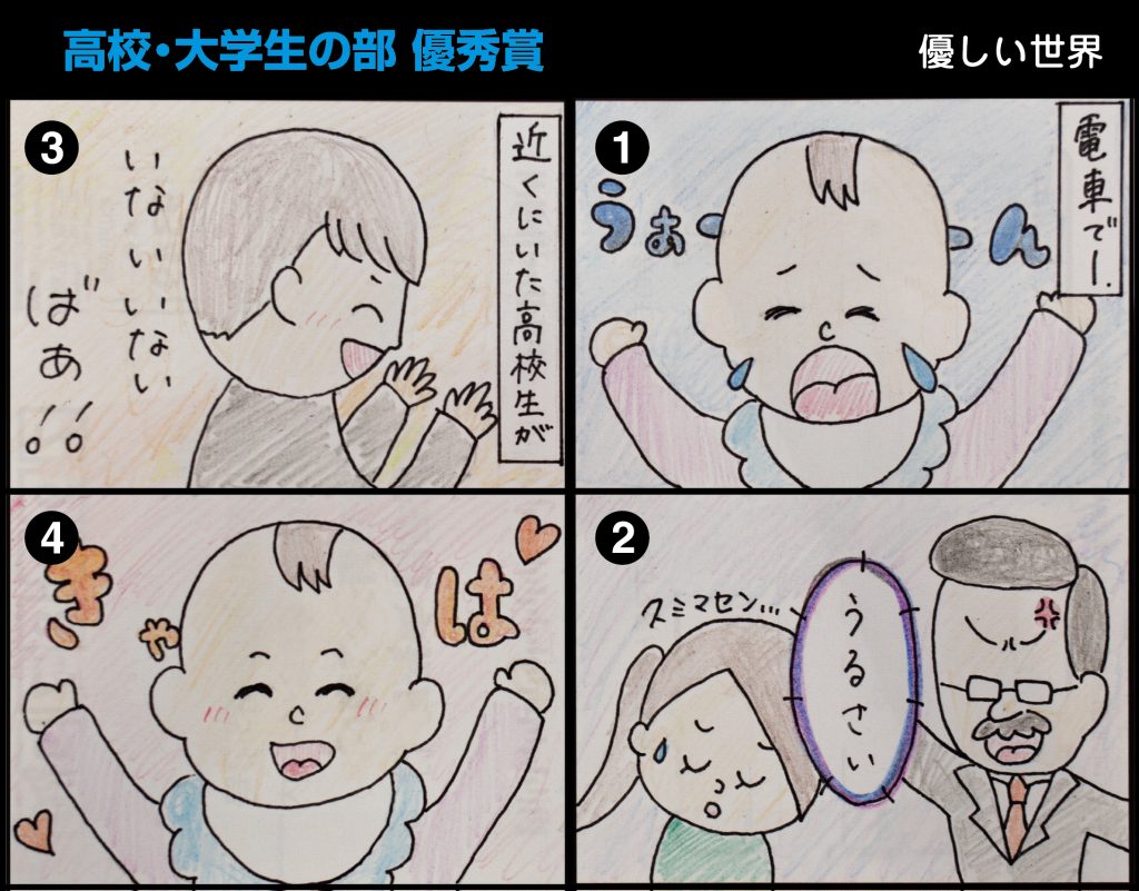 高校大学生の部について。最優秀作品は、数多くあった写真を使った作品の中で最も優れていました。写真がすっきりしていて美しく、ふきだしや文字の構成もよくまとまっています。優秀作品は、何気ない些細な出来事に着目しながらも、結果が肯定的なストーリーで新鮮です。イラストもわかりやすくすっきり表現できています。