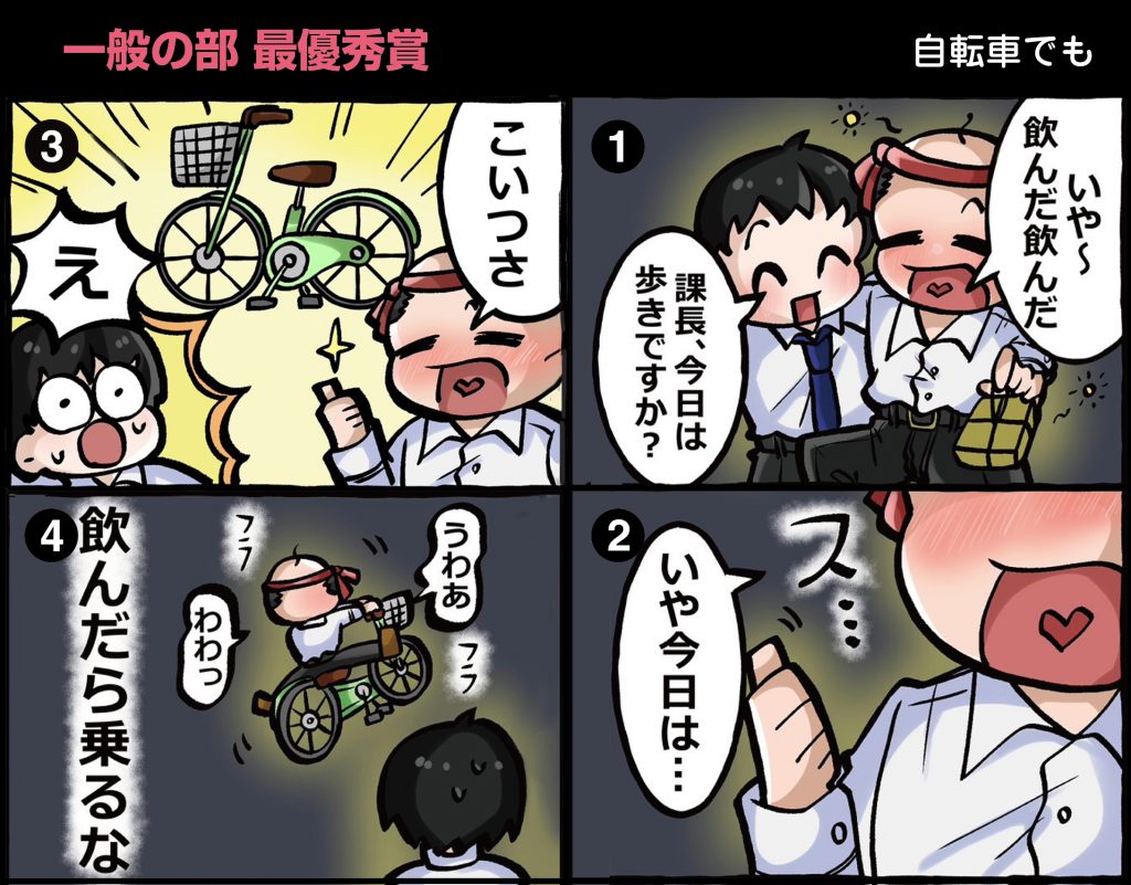 一般の部について。最優秀作品は、ありがちでありながら新鮮なテーマを、ストーリーとイラストともにうまくまとめています。ドキッとする大人も少なくないのではないでしょうか。ただ、誤解しないでいただきたいのは、自転車の飲酒運転はモラルやマナーの問題ではなくて法令違反で罰せられるということです。優秀作品は、否定的な表現ではなくて、肯定的でよくなって成長している場面を描いて作品にしています。イラストも描画力があり、構成も工夫されています。